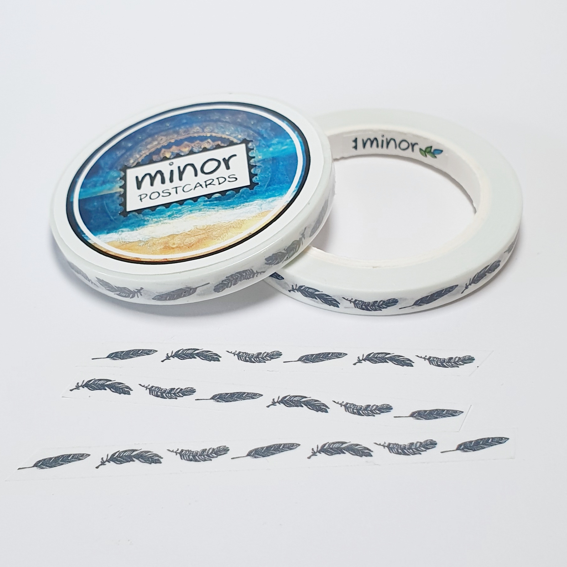 Tämä washiteippi on kapea ja sen takia erityisen sopiva postikorttien koristeluun, koska tilaa on vähän. Tässä teipissä on mustia sulkia jatkuvana ketjuna.