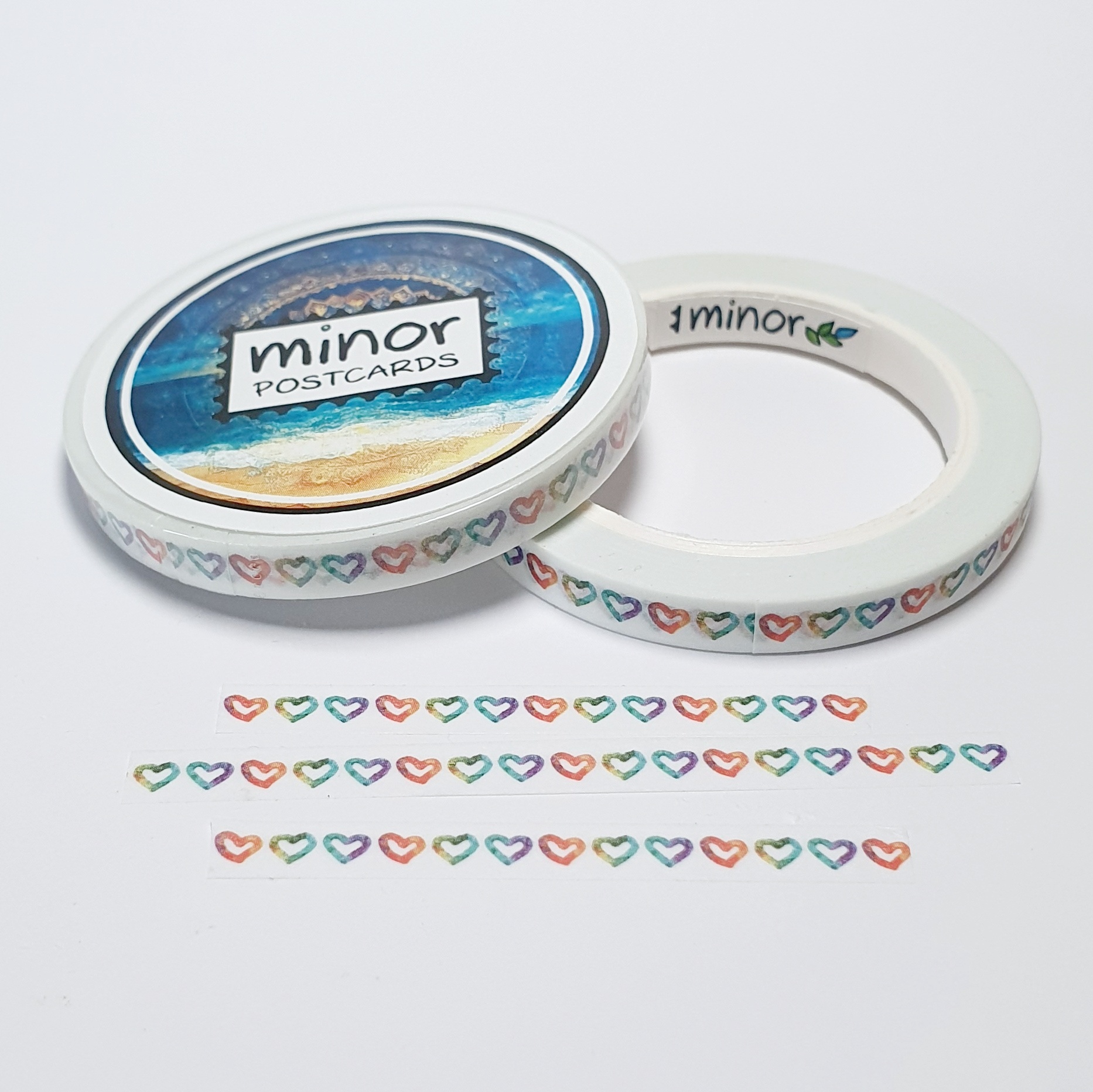 Tämä washiteippi on kapea ja sen takia erityisen sopiva postikorttien koristeluun, koska tilaa on vähän. Tässä teipissä on paljon monivärisiä sydämiä.